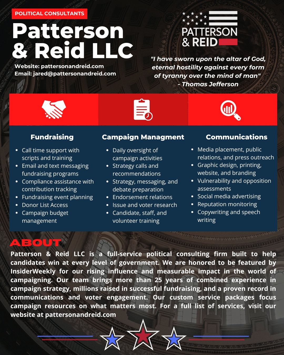 Too many consultants recycle the same strategies and expect different results. Patterson & Reid was built for candidates who refuse to settle. Strategy is our foundation, and data is our guide. We don't guess; we plan and win. Here's how we do it:
